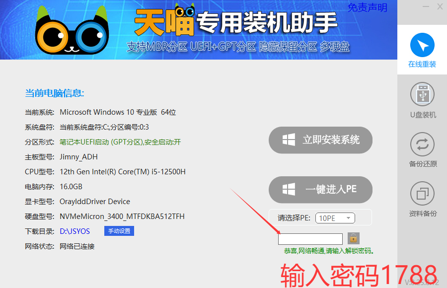 1.提前关闭电脑所有杀毒,下载好天喵一键重装工具后解压到桌面下载https://wwbba.lanzouu.com/b03anavpcb 密码:66662.管理员运行软件过后,输入密码1788回车,点击立即安装系统进入系统选择界面3.选择极速纯净版中,win10 22h2专业版点击安装后等待自动重启电脑即可4.开机后联网运行工具包中的驱动总裁VIP版.exe给电脑驱动打补丁,打补丁后双击运行一键去浏览器配置推广.bat,用来去除浏览器广告推广即可!